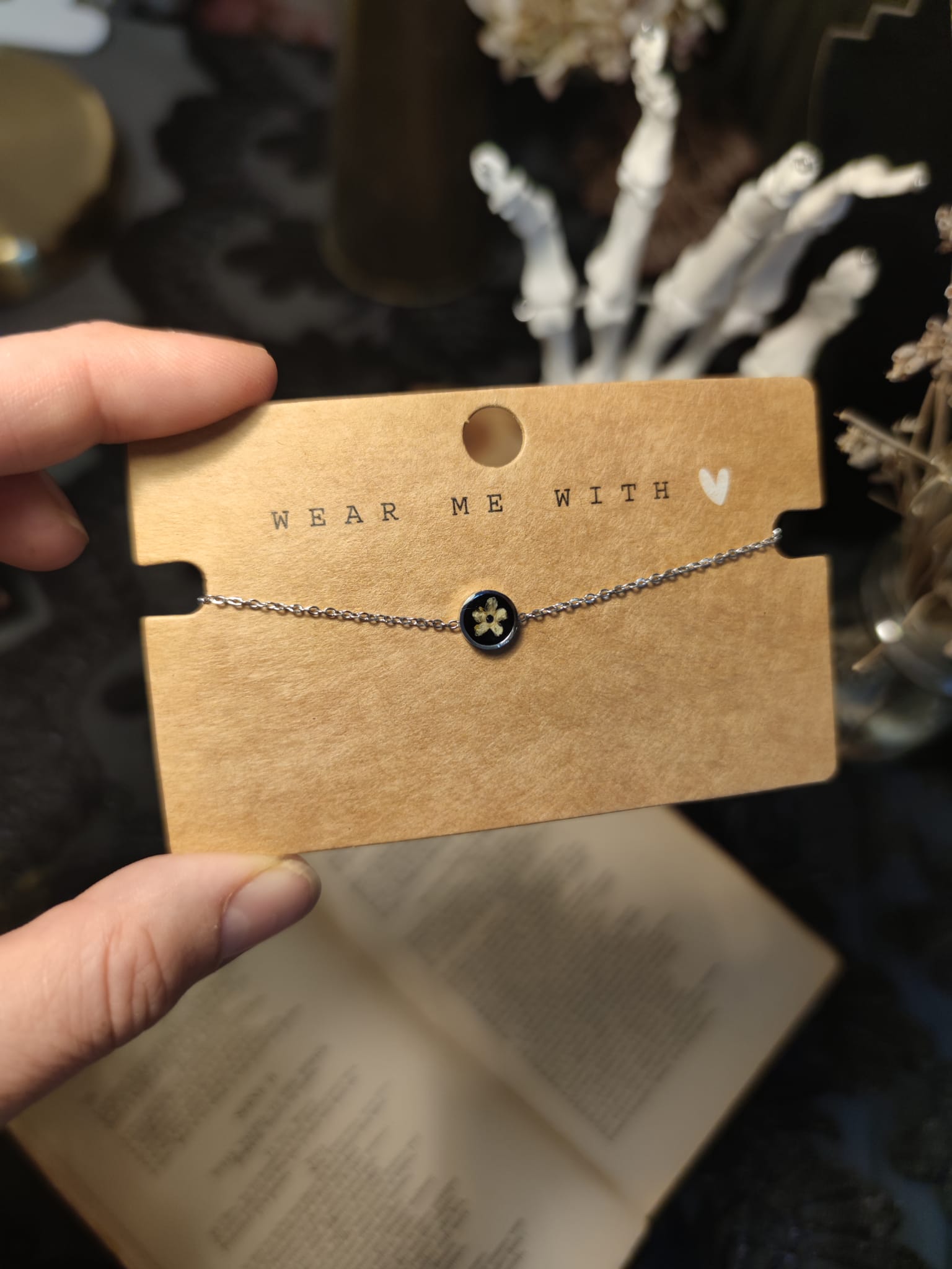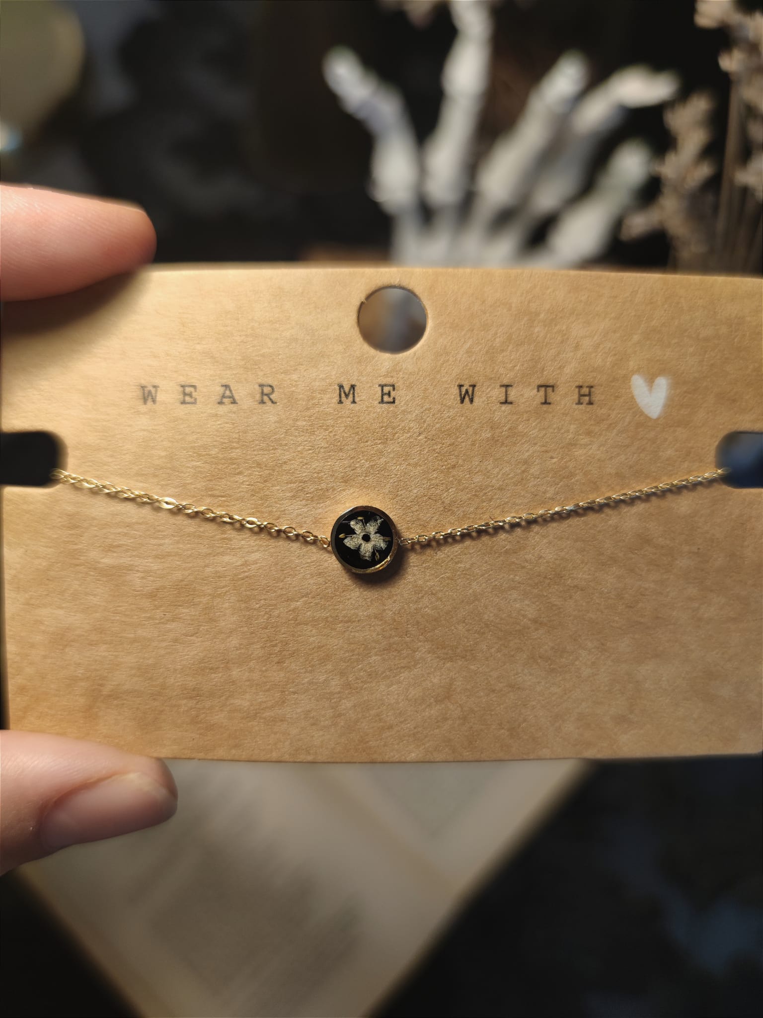 Bracelet fait main en résine époxy et fleur séchée. L’acier inoxydable vous permet de porter le bijou sans risque d’oxydation. Il est incrusté d’une fleur, ramassée et séchée naturellement dans la nature Auvergnate.